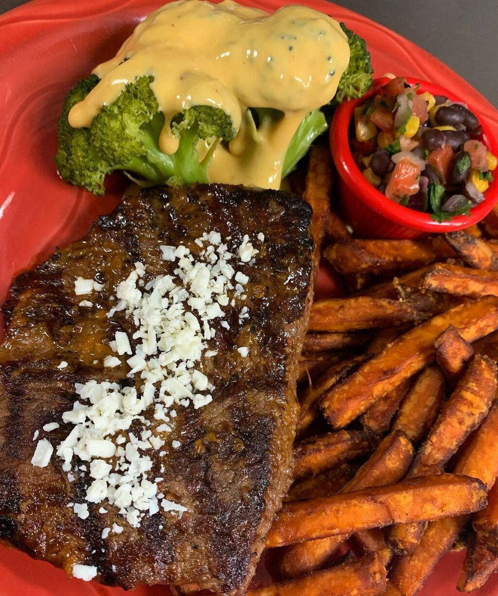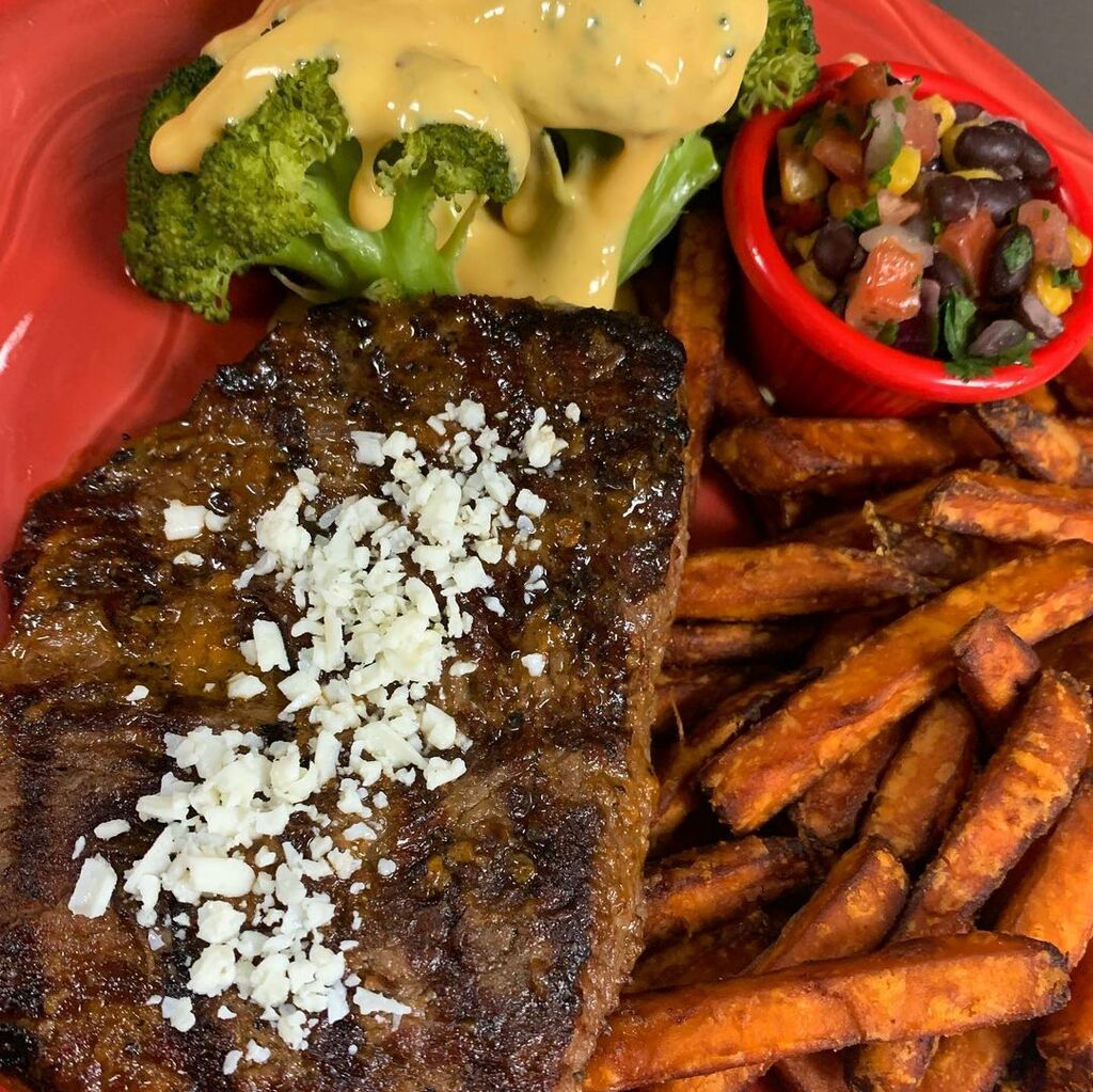 A 10 oz. "flame grilled" Shoulder Tenderloin Steak seasoned in our Asada Chile marinade, topped with crumbled Cotija cheese...served with Sweet Potato Fries, steamed Broccoli and garnished with Roasted Corn-Tomato-Cilantro Salsa.