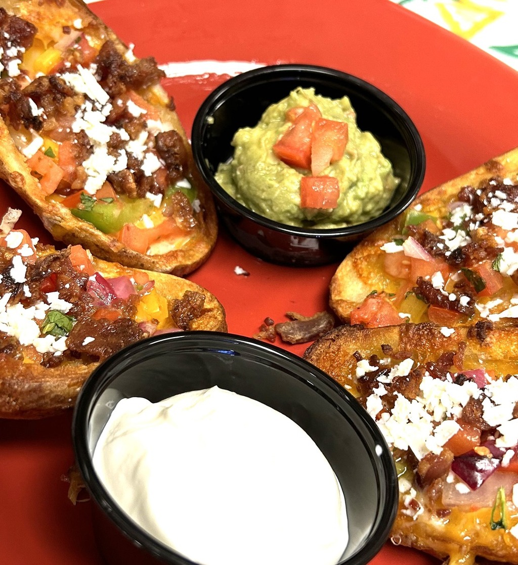 Layers of Refries, Ground Beef, Chili con Queso, melted Jack and Cheddar ‘n topped with Pico de Gallo…served with sour cream ‘n Tortilla Chips.