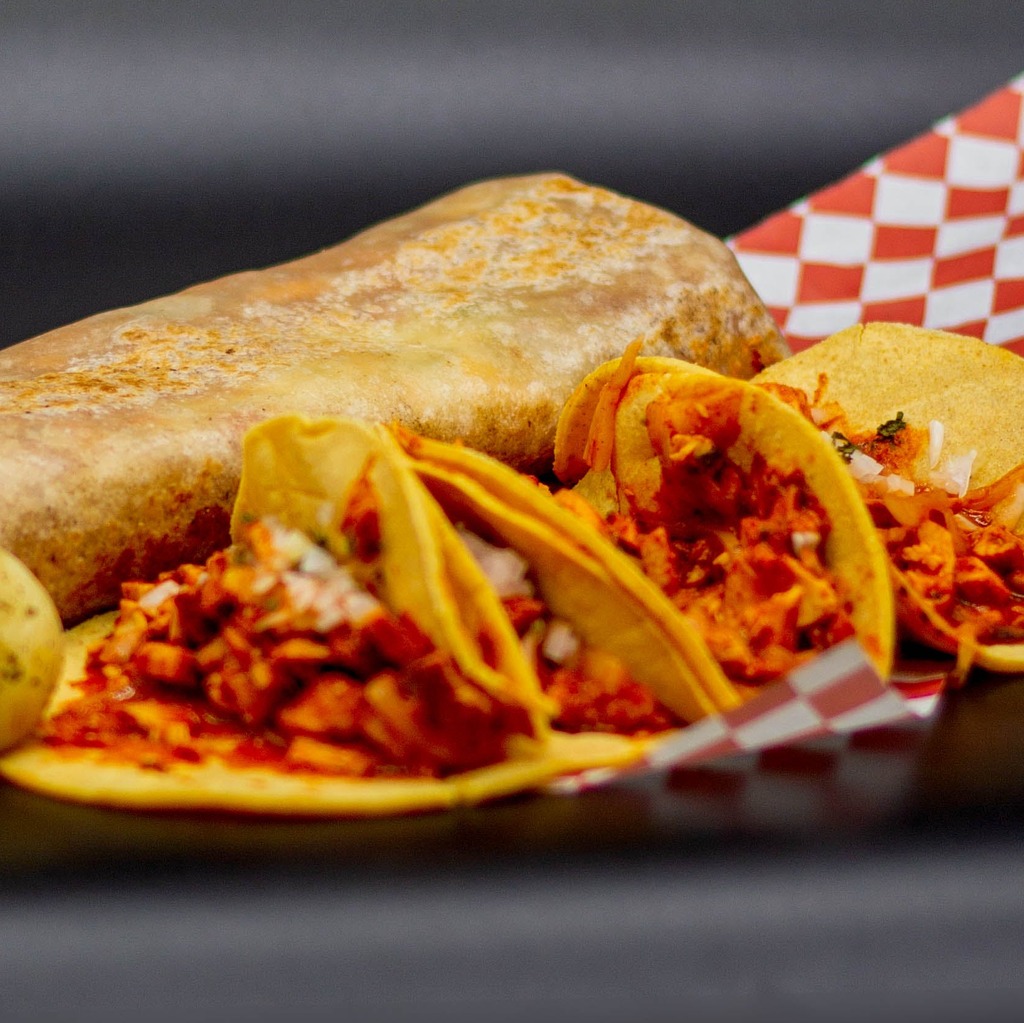 A seasoned Ground Beef Taco and a 6” Bean Burrito topped with Chile con Queso. Served with Spanish Rice.