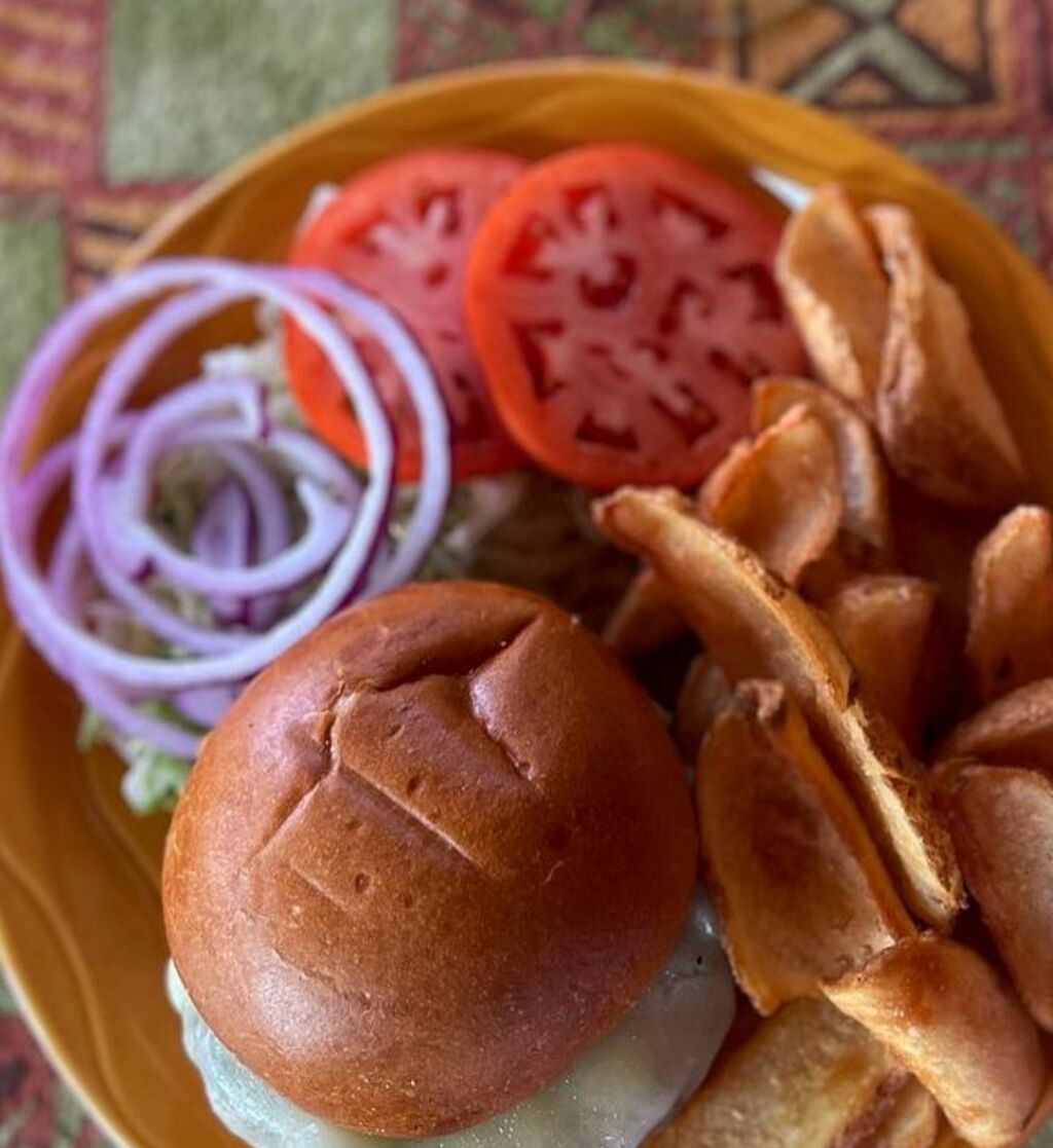 An 8 oz. Ground Beef patty “flame-grilled” to order with Lettuce, sliced Tomato ‘n Red Onion...served with fries.