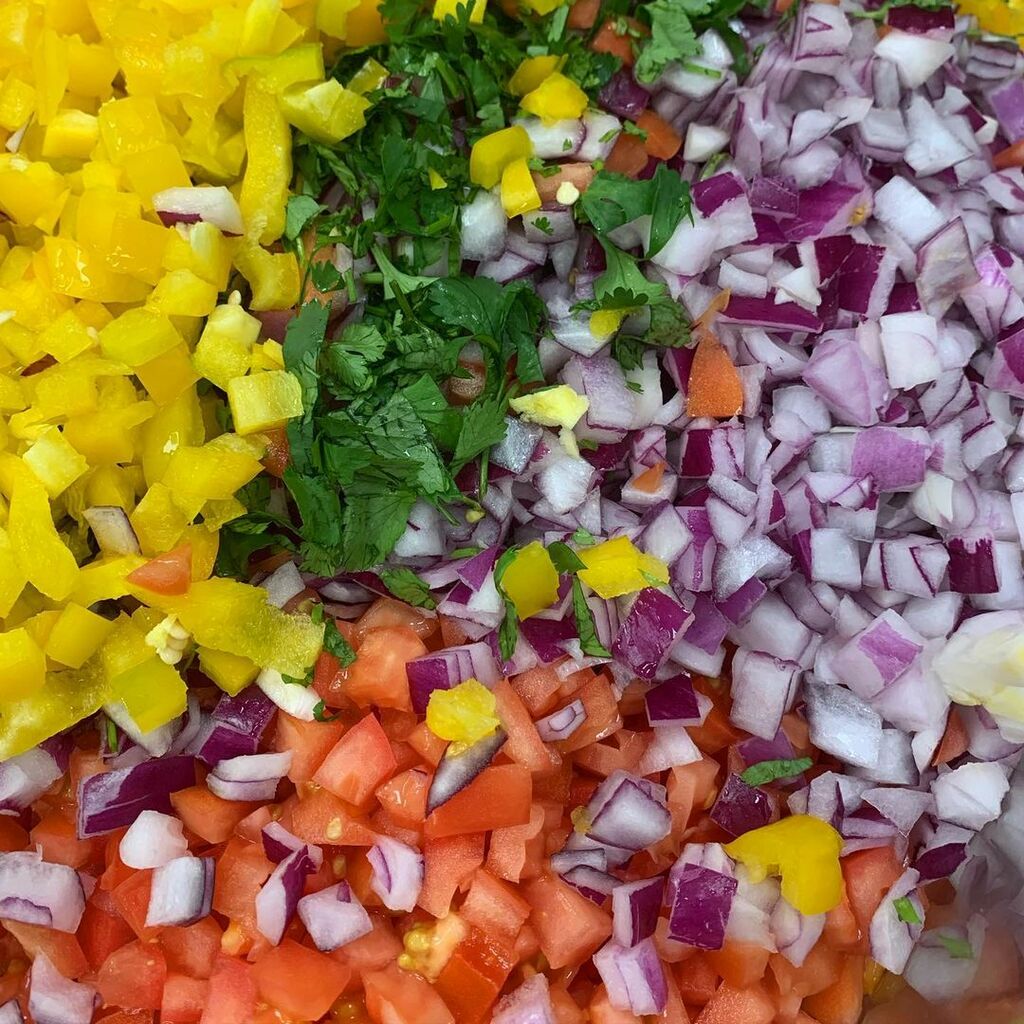 Spanish rice with steamed Broccoli con Queso and garnished with Roasted Corn ‘n Black Bean salsa.