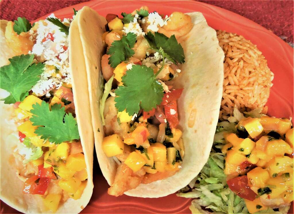 Flour tortillas filled with crunchy “flash-fried” Shrimp seasoned with Southwest spices, along with Chipotle Cream Cheese, shredded Cabbage and topped with a chunky Habanero-Mango ‘n Red Pepper Salsa and crumbled Cotija Cheese…served with Spanish Rice.