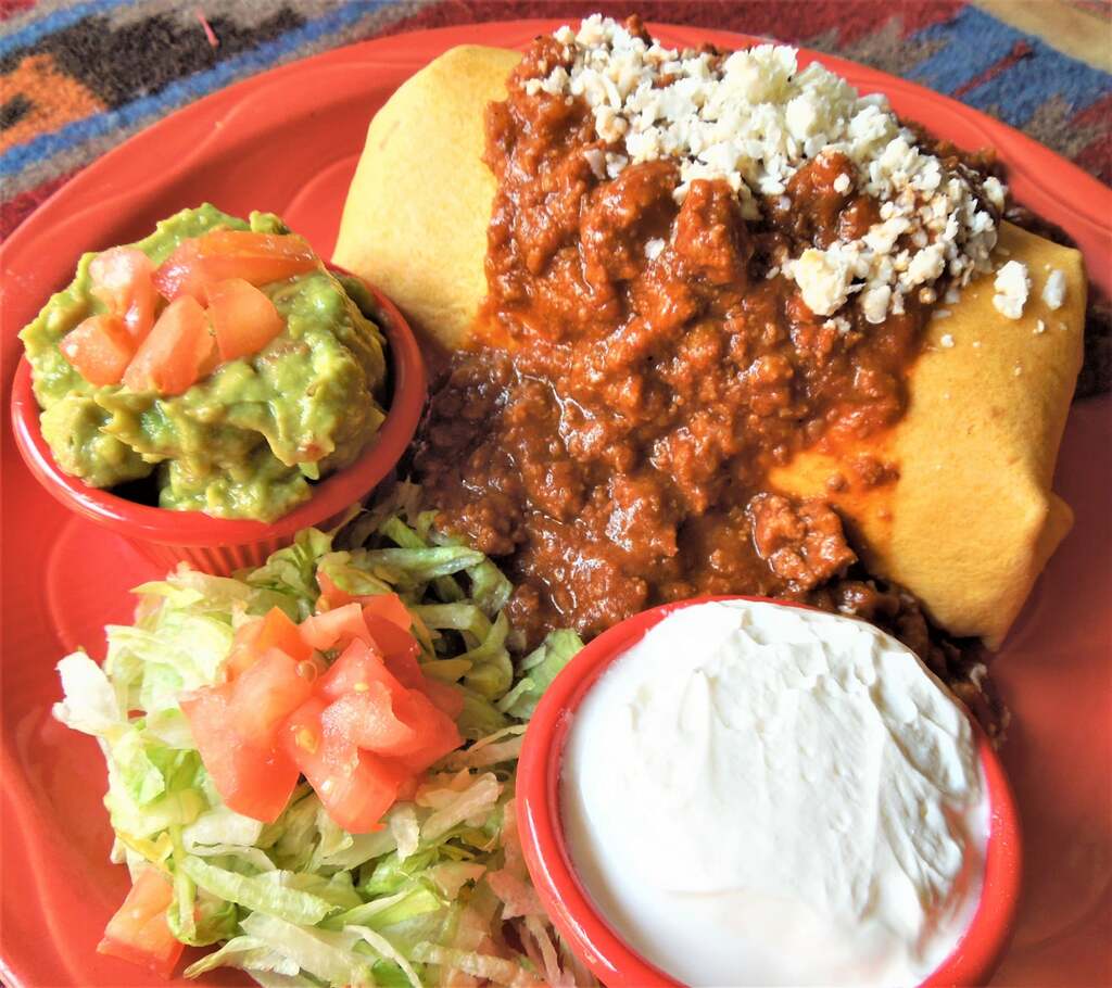A 8” flour tortilla filled with Seasoned Ground Beef and Refried Beans, smothered with Enchilada Sauce and melted cheese. Served with Spanish Rice, lettuce, tomato and sour cream.