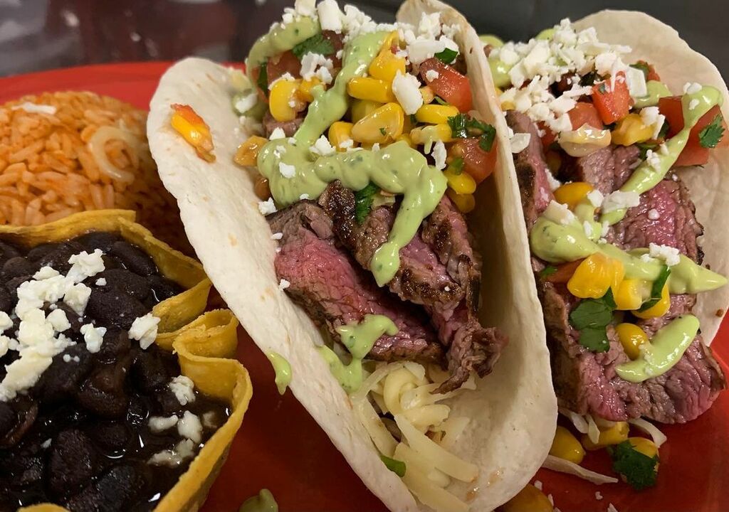 A “trio” of Soft Flour tortillas with “Flame grilled ‘n sliced” Asada Chile marinated Shoulder Tenderloin, Jalapeno Cream Cheese, shredded Cabbage, a Roasted Corn-Tomato & Cilantro Salsa, topped with Avocado Crema ‘n crumbled Cotija Cheese.