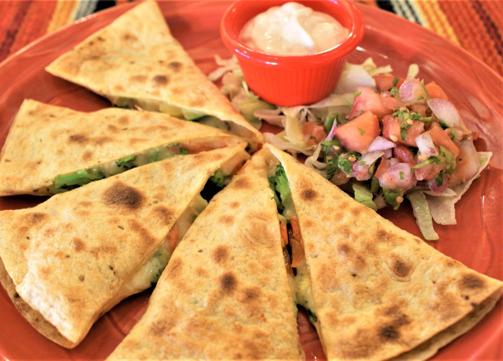 Plain and simple. Sliced Chicken, Jack and Cheddar Cheese baked in an 8” Flour tortilla. Garnished with lettuce, tomato and sour cream.