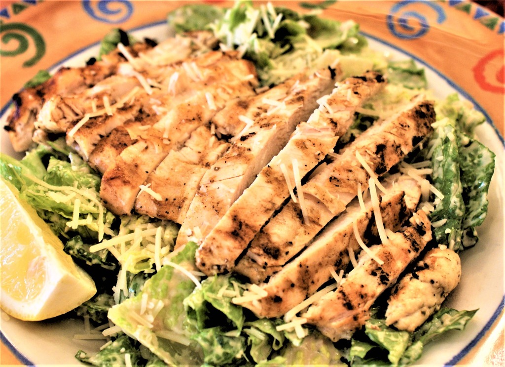 Grilled sliced Chicken Breast served over Romaine with Pico de Gallo, Black Olives, Monterey Jack & Cheddar, Guacamole, Tomatoes and sour cream… with side of Flour tortillas.