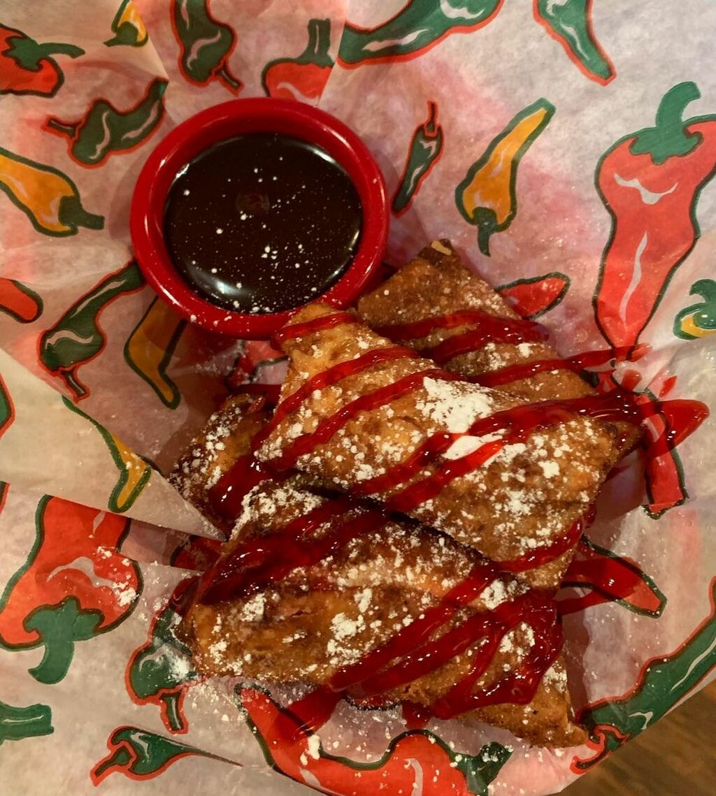 A “Quartet” of fried ‘n crunchy Chimichangas stuffed with a Raspberry Cheesecake filling; dusted with Powdered Sugar and served with warm Chocolate Fudge ’fer dippin’.