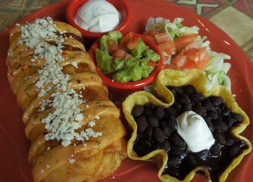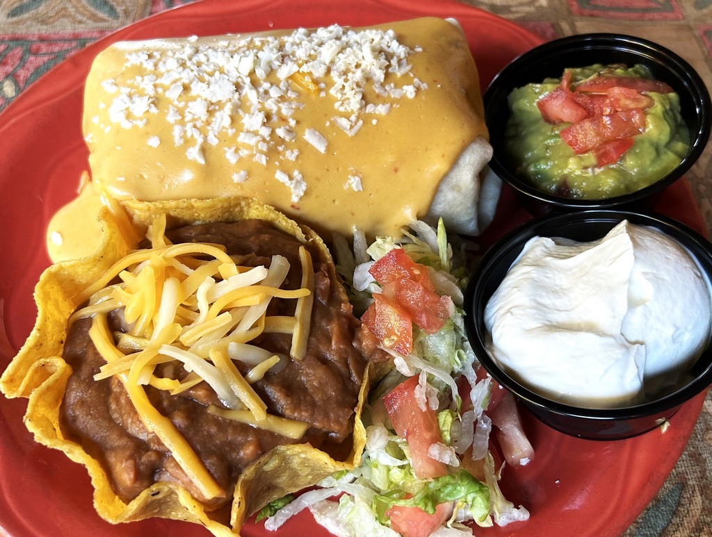 A Black Bean Burrito with Chili con Queso, a Cheese ‘n Onion Enchilada with Del Norte Sauce, a Guacamole Salad Cup and served with Spanish Rice.