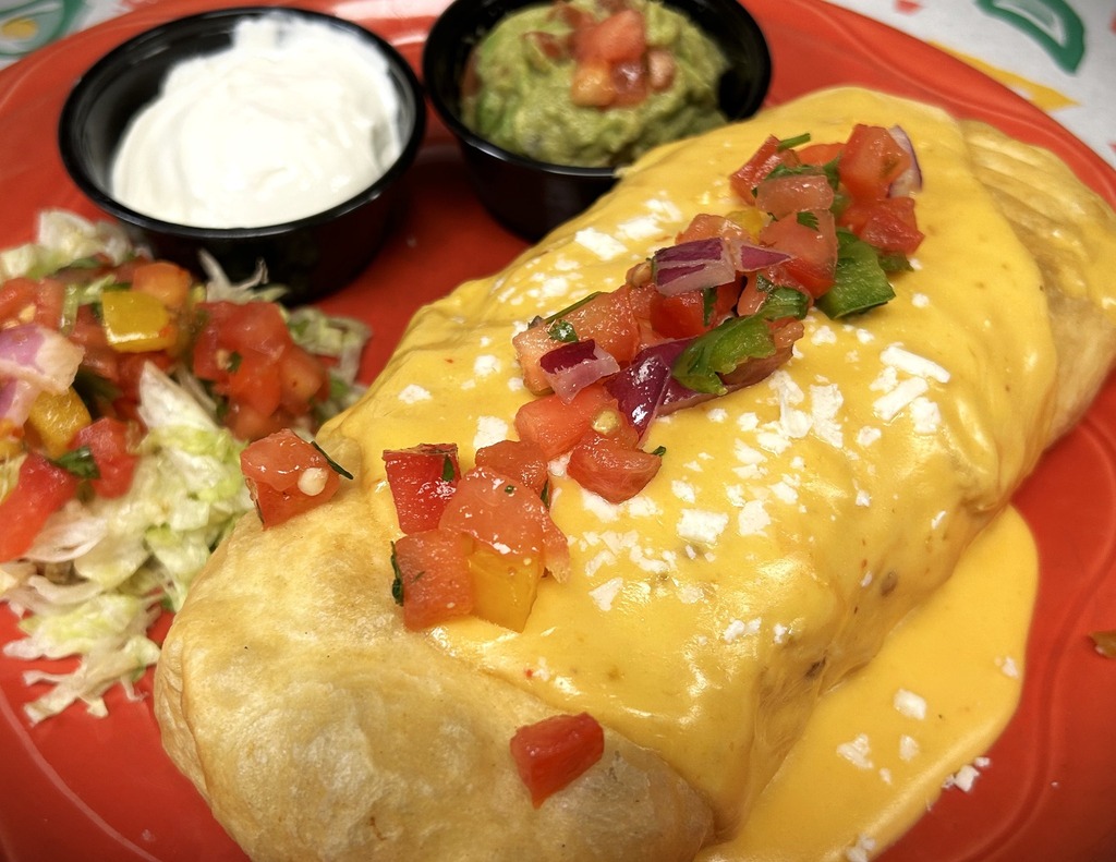 A large Flour Tortilla “rolled & stuffed” with seasoned Pulled Chicken, Chipotle Cream Cheese, Roasted Corn-Tomato ‘n Cilantro Salsa, Spanish rice and topped with Chile con Queso. Served with Refried Beans and a side of Guacamole.