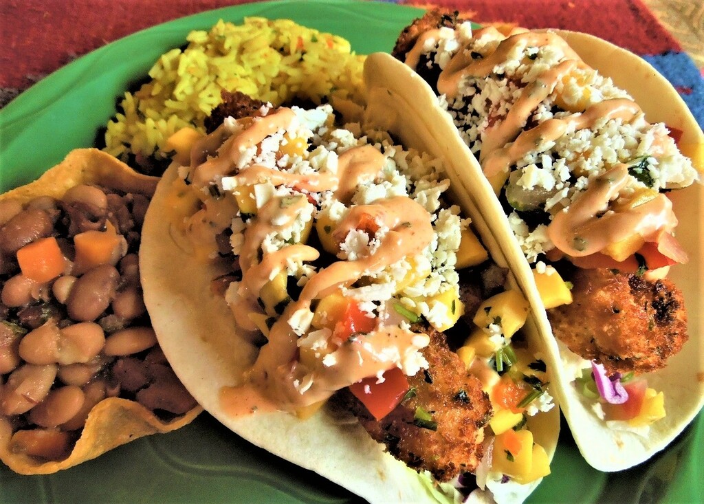 Flour tortillas filled with “crispy” filets of Cod, shredded Cabbage and topped with a chunky Habanero-Mango ‘n Red Pepper Salsa, a swirl of “Smokey” Chipotle Aioli and crumbled Cotija Cheese… served with creamy Cole Slaw.